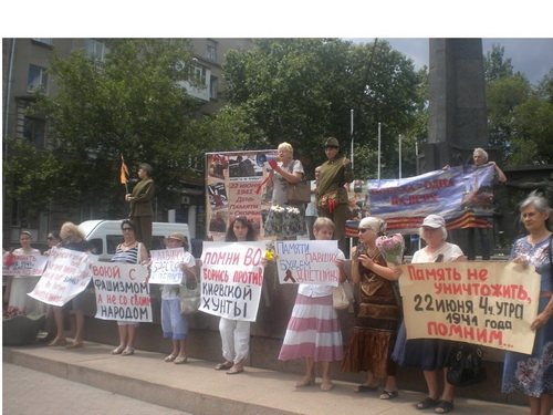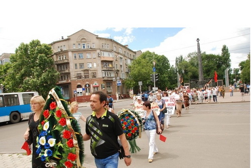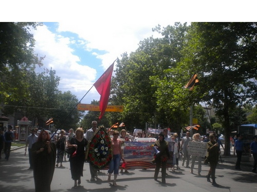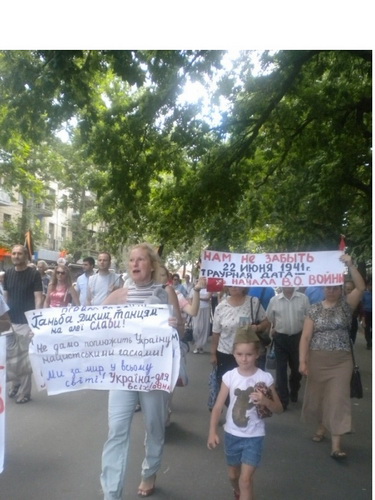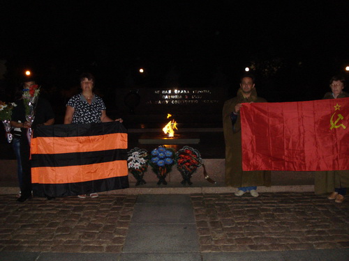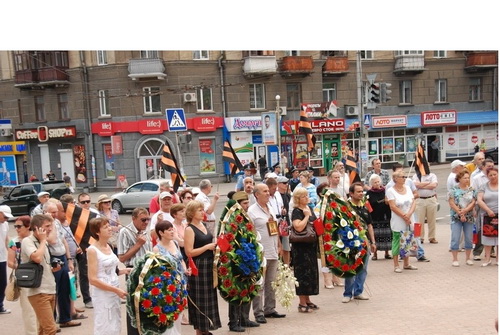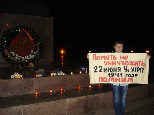 Был возложен венок, цветы к памятнику Лягина, участники зажгли свечи. Дальше колонна двинулась через Советскую к Вечному Огню и мемориалу героев-ольшанцев. Следует отметить, что на пересечении улицы Советской с Адмиральской участников демонстрации встречали оппоненты с традиционными криками "Слава нации...". На что участники акции попытались их вразумить, говоря, что сегодня день начала войны и не время юродствовать. Молодые участницы в военной форме говорили о том, что в вас течет славянская кровь - и это значит, что рано или поздно вы одумаетесь и будете на нашей стороне.