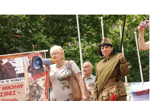 В 12 часов более ста человек собрались у стелы Освободителей города. В руках у многих были красные флажки победы, а также флаги в виде георгиевских ленточек. Несколько молодых ребят были одеты в военную форму. Это не случайно. Ребята в военной форме того времени, им было по 18-20 лет. Столько же лет было и тем ребятам, которые в далеком 41-м уходили на фронт. Кто-то ушел сразу со школьной скамьи, кто-то оставил учебу в институте, потому что перед ними была главная задача - защитить страну от фашизма.