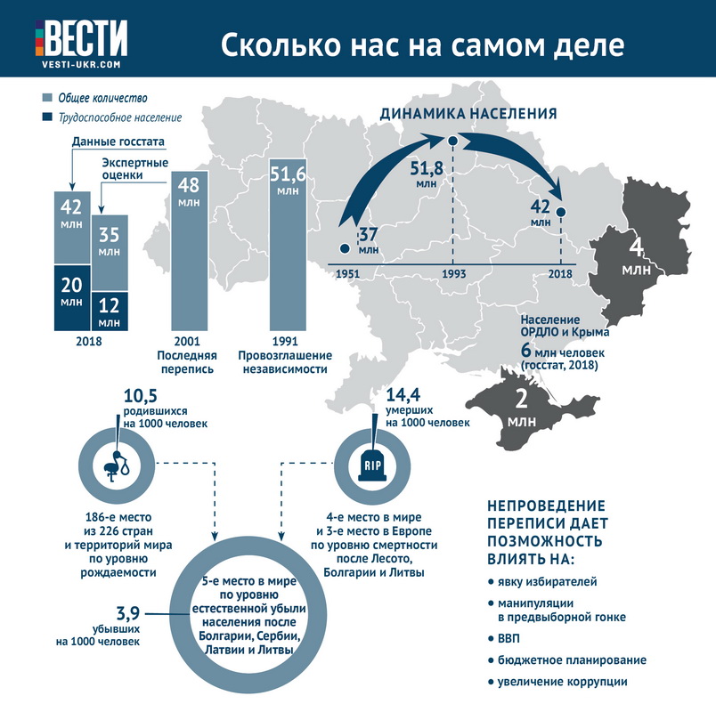 Вот уже 17 лет в Украине не проводится перепись населения. Несмотря на рекомендации ООН, в которых четко прописаны требования проводить перепись не реже, чем раз в 10 лет, сменяющиеся правительства не торопятся решать этот вопрос. Перепись переносили с 2012 на 2014 год, в 2016-м снова отложили. Обещают в 2020-м - но проведут ли? Всемирный день народонаселения, который отмечается 11 июля, праздником в Украине считать не выйдет, ведь наше демографическое положение плачевно – рождаемость стабильно падает, а по смертности мы в лидерах. Затягивание с проведением переписи, по мнению социологов и демографов, – огромное поле для манипуляций как в экономической сфере, так и в политике. В свете предстоящих выборов "Вести" разбирались, кому может быть выгодна неточная статистика о народонаселении.