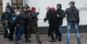 Сторонники новой власти пытались прорваться в горсовет, но их побили и отогнали от здания "антимайданщики". Часть участников столкновения была вооружена палками.