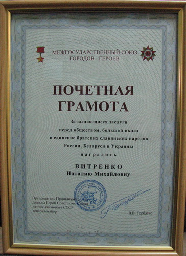 За выдающиеся заслуги перед обществом, большой вклад в единение братских славянских народов России, Белоруссии и Украины Межгосударственный союз городов-героев в лице Председателя Президиума, дважды Героя Советского Союза, летчика-космонавта СССР, генерал-майора В.В.Горбатко наградил Почетной Грамотой лидера Прогрессивной социалистической партии Украины, доктора экономических наук Наталию Михайловну Витренко.