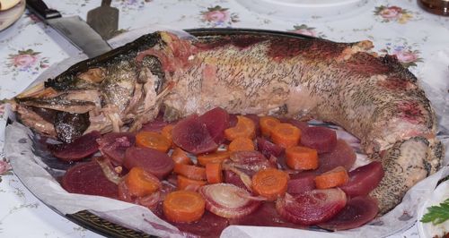 Наталия Витренко поздравила Владимира Марченко лично пойманной и потом ею нафаршированной щукой