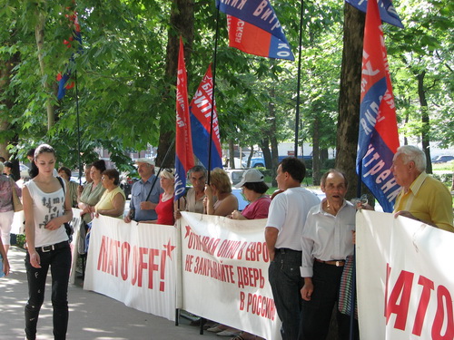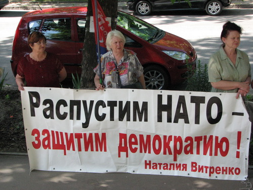 Действо началось уклончивыми и невнятными выступлениями мэра Чайки и зампредседателя облсовета, которые вроде бы и не за НАТО, но не хотели реально отстаивать позицию, близкую нашим землякам. А когда к микрофону подошел господин Дюре, над головами депутатов-витренковцев взлетели лозунги, написанные для лучшего понимания на английском языке – "НАТО – серийный убийца", "НАТО означает смерть и войну!" и "НАТО –вон с Украины!". Эти лозунги, да и песни военных лет, которые доносились через открытые окна, так сбивали посла НАТО, что он мямлил и с трудом выговаривал штампованные фразы. Каждое его слово вызывало бурные протесты, и не прошло и пяти минут, как Дюре вернулся на свое место.