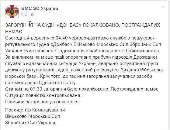 Скриншот сообщения о чрезвычайном происшествии на странице ВМС ВСУ в Facebook. Вскоре последовало успокоительное уточнение о том, что "на судне горели бытовые помещения - душевая и сауна. Площадь возгорания составила не более 10 квадратных метров. Причиной стала электропроводка". Затем поступающие новости становились все более мрачными. Комиссия ВМС Украины, которую Командующий Военно-морских сил ВСУ Игорь Воронченко назначил для расследования причин пожара, приступила к работе по выяснению конкретных причин и размеров понесенных, а также установлению виновных. Попутно командование ВМС выразило благодарность Главному управлению ГСЧС в Одесской обл. и морском порту Одессы "за оказанную помощь в тушении этого пожара", что "позволило в кратчайшие сроки локализовать возгорание, полностью ликвидировать пожар, что, в свою очередь, предотвратило значительный материальный ущерб". Согласно официальному заявлению пресс-службы ВМСУ "в командовании полагают, что техническую и боевую готовность "Донбасса" удастся восстановить в ближайшее время". Несмотря на полученную благодарность и оптимизм флотского бронетанкового командования, источник в Главном управлении ГСЧС в Одесской обл., пожелавший остаться неизвестным, рассказал, что в действительности "огонь распространился на десятки квадратных метров, пламя охватило бытовые помещения, каюты и рубку на двух палубах", то есть фактически на судне выгорела вся надстройка. Площадь горения составляла более 100 кв. м. Всего было задействовано около 20 единиц пожарной техники, а непосредственно в тушении участвовало 7 стволов с пожарными расчетами. Со стороны моря к судну подошел пожарный аварийно-спасательный буксир "Гранит" и с помощью 3 своих стволов также участвовал в тушении пожара. Причиной, усугубившей результаты пожара стал, по информации того же источника, "возраст судна (более 40 лет), который сказался, в частности, на износе перегородок и других частей судна". Тушению пожара также препятствовало сильное задымление, которое возникло из-за продуктов горения кают экипажа. В результате спасательных работ судно набрало в себя много воды и получило заметный крен. Ведутся работы по ее откачиванию.