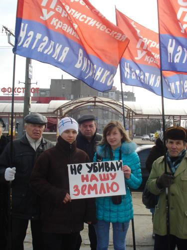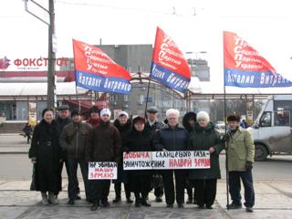 Наш пикет мы выставили по центральному проспекту города, по проспекту Ленина. Мы пытаемся "докричаться" до людей. Люди, осмотритесь! Скажите: "НЕТ КАПИТАЛИЗМУ!", "НЕТ ВЛАСТИ ЭКСПЛУАТАТОРОВ", "ДА СОЦИАЛИЗМУ!", ведь добыча сланцевого газа на Украине уничтожит нашу с Вами землю, на которой должны жить наши с вами дети и внуки. Только те, кто не задумывается о дальнейшей судьбе нашей земли, могут так поступать со своим народом.