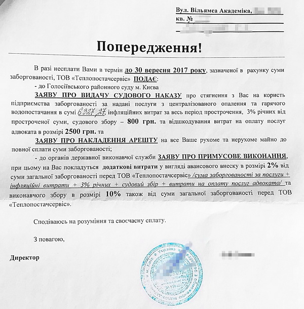 Перед отопительным сезоном киевлянам все чаще вручают «письма счастья», где указано, что на них подают в суд, по решению которого с них взыщут сумму долга, штрафную пеню, судебные затраты и даже услуги адвоката. Как узнали «Вести», в киевских судах уже даже назначены такие заседания.