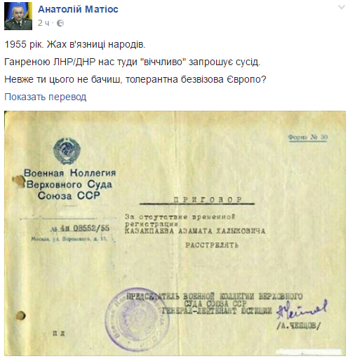 26 января этими качествами отличился главный военный прокурор Украины Анатолий Матиос, опубликовавший на своей странице в соцсети «приговор», якобы вынесенный Военной Коллегией Верховного Суда Союза ССР.