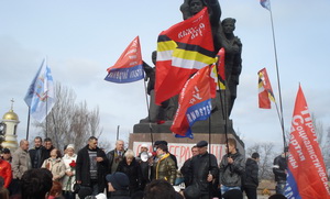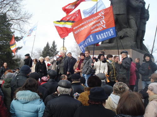 Без привлечения СМИ, без организованного оповещения, на площадь пришли более полутора тысяч горожан. Из самого сердца рвались слова горечи и негодования. Выступающие с презрением говорили о предательстве Януковича, сдавшего Украину отъявленным бандитам, боевикам из фашистских организаций, преступникам, обагрившим свои руки кровью безоружных солдат. Лидер организации ПСПУ Анна Павлова предложила митингующим растоптать и сжечь черно-красное знамя нациков, и участники митинга с искренним чувством приняли участие в этом.