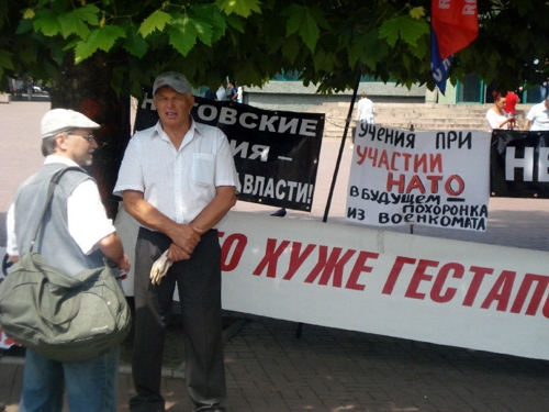 На агитационной палатке собирают подписи против сотрудничества с агрессивным блоком, который бомбит Ливию, убивает мирных жителей в Афганистане и Ираке.