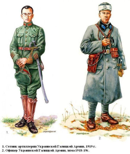 Скажем больше – погонов с "ромбами" не было и у армии УНР, "петлюровцы" носили прямоугольные петлицы с пятиконечными звездами. Как непатриотично! Но откуда же то тогда фото тех лет молодые офицеры с легко узнаваемыми погонами немецкого образца? Это униформа армии гетмана Скоропадского! Так как его держава существовала только благодаря присутствию в Украине немецких войск, то нет ничего удивительного в том, что гетман-германофил, недолго думая, позаимствовал у своих покровителей дизайн униформы. В декабре 1918 года часть гетманских офицеров, сбежавших в западном направлении, влились в УГА – где и щеголяли в своей старой форме до весны 1919 года, пока не переоделись в кители с "зубчатыми" петлицами.