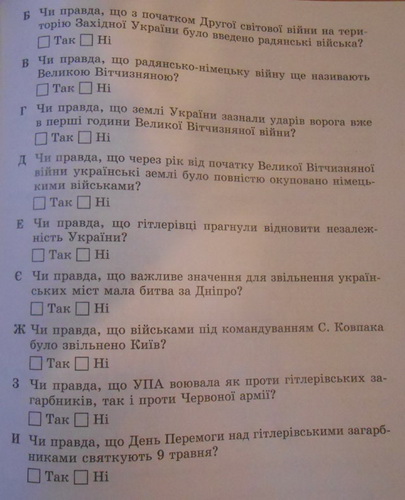 Так, например, пункт "Б" предлагает варианты ответов "да" или "нет" на вопрос "Правда ли, что с началом Второй мировой войны на территорию Западной Украины были введены советские войска?" Такие же полярные ответы возможны для вопроса "В" – "Правда ли, что советско-немецкую войну еще называют Великой Отечественной?"