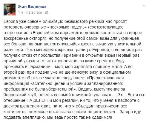 Пока мы ждем открытых границ с Европой, я во второй раз получаю отказ от посольства Германии в открытии визы!» - написал спортсмен на своей странице в соцсети, прикрепив фото отказа из посольства Германии.
