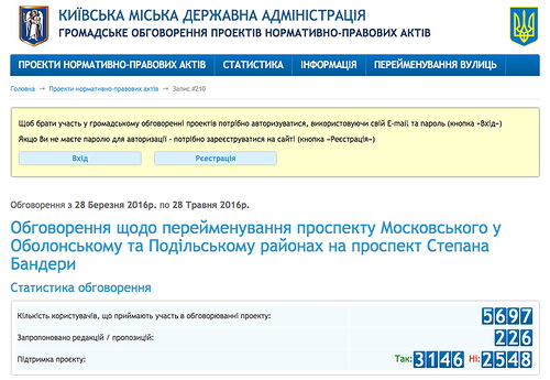 Но комиссия по вопросам переименований при киевском городском голове «без шума и пыли» поддержала предложение института нацпамяти о переименовании Московского проспекта в проспект Степана Бандеры, разместив на «сайте общественного обсуждения» инициативу для голосования. Чтобы можно было заявить – это делается «не корысти ради, а волею пославшей мя жены», т.е. «громады Киева». Как у нас на Украине проходят такие голосования, мы знаем...