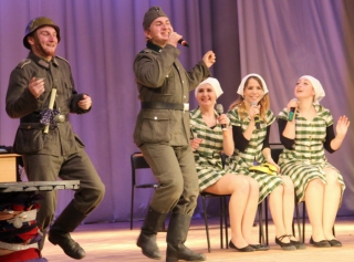 Возвращаемся к спектаклю. Эти же фабричные девушки по ходу спектакля мгновенно становятся немками (спектакль идет в быстром темпе) и с кривлянием вызывают по телефону для своих развлечений "кровавого гестаповца" и "страстного Сталина". Что враг, что победитель... Смешно, но не очень.