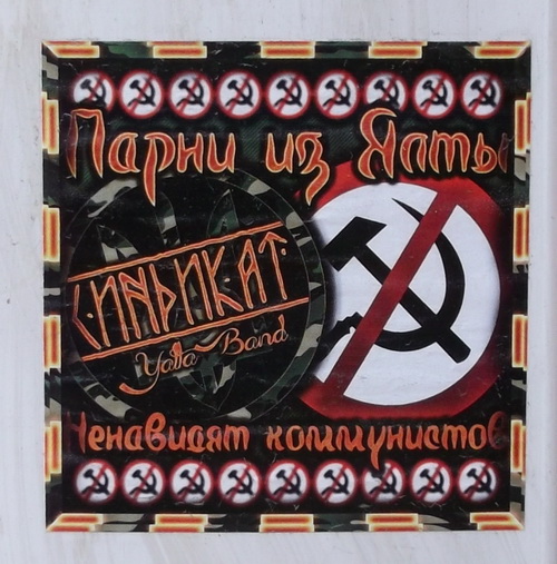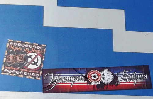 Следует добавить, что не только эта кощунственная надпись, вызвала гнев у ялтинцев. Представители неонацистского "синдиката", как мартовские коты, изрядно "пометили" территорию вокруг автовокзала и ближе к центру города своими листовками (см. фото), причем их символика соседствовала рядом со "стикерами" (наклейками) фанатов ФК "Таврия". Кстати, на гладкой поверхности стикера очень неплохо сохраняются отпечатки пальцев, а возле большого граффити под мостом много натоптанных следов на песке – но это информация к размышлению для нашей доблестной милиции, если она действительно будет стараться расследовать это дело...