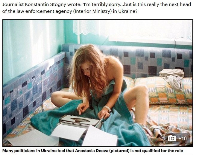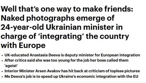 Желтый бульварный таблоид Daily Mail опубликовал фотографии в стиле ню 24-летней заместительницы министра МВД Анастасии Деевой, обучавшейся в Великобритании. В статье говорится, что ее критикуют за юный возраст, а также отсутствие необходимой профессиональной подготовки.