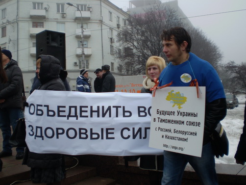 Выступающие на митинге Геннадий Хоменок Г.В. и представитель общественной организации "Союз граждан Украины", Алексей Гаврилко, заявили, что единственное будущее Украины – это вступление Украины в Таможенный союз России, Белоруссии и Казахстана призвали всеми силами бороться с Евромайданом. Только вместе с Россией и Белоруссией мы можем дать достойный ответ интервенции США и ЕС и ещё мы заявляем, что славяне никогда не стояли на коленях перед интервентами и никому их поставить не удастся! Кто к нам с мечом придёт – тот от меча и погибнет. В объединении наша сила и победа!