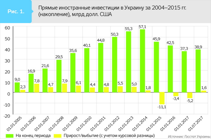 Объем прямых иностранных инвестиций в Украину в 1 полугодии 2017 г., по сравнению с аналогичным периодом прошлого года, сократился в четыре раза и составил всего 711,2 млн долл. США (или 18,9 млрд грн по курсу 26,5 грн/долл.).