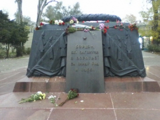 Немного прийдя в себя, я решила возложить цветы к братской могиле жертв гражданской войны. Там похоронены борцы за власть Советов в Одессе. Проезжая, я увидела в одном из балконов красный флаг. Помнят наши люди эту великую дату. Не бояться показывать свои убеждения, несмотря на угрозы нацистов. Возле памятника уже были возложены цветы. Как я узнала позже, здесь прошел небольшой митинг, посвященный 100-летию Великой Октябрьской Социалистической Революции. Неподалеку от этого места находится Дом Профсоюзов, где 2 мая 2014 года были сожжены 48 (а скорее всего, гораздо больше) одесситов. И я почтила память этих героев, отдавших свои жизни за наш город.
