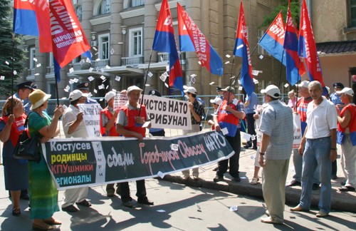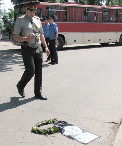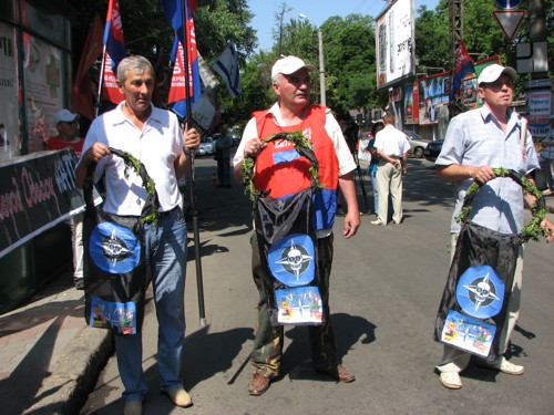 Сегодня, в ходе проведения мирной антиНАТОвской акции, активисты витренковцы выполнили Вердикт мирового Трибунала и повесили НАТО перед одесским Домом Офицеров. Живым НАТОвцам, прибывшим на итоговую конференцию по учениям СИ-БРИЗ 2011 достались похоронные венки, которые через ограждения летели на их головы.