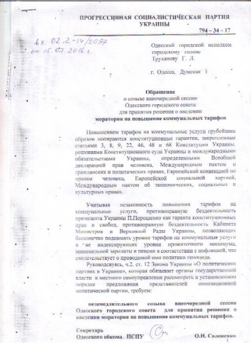 15 июля текущего года Одесский обком ПСПУ обратился к Одесскому горсовету с требованием незамедлительного созыва внеочередной сессии Одесского городского совета для принятия решения о введении моратория на повышение коммунальных тарифов.
