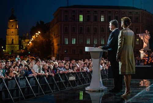 Наконец, в этот день было у Порошенко еще выступление во время художественной программы "С нами Бог". Обращаясь к присутствующим на Михайловской площади, он отметил, что более тысячи лет назад были заложены основы свободной и независимой Украины, говорил он "о единстве Украины в пространстве" и "единстве Украины во временном измерении" (прямо по Грушевскому), об "основах связи государства со странами Запада". Особое внимание уделил тому, что сегодня украинцы, как и тысячу лет назад, снова возвращаются в Европу, "как в родной дом". И возвращаются они, ведя битву против "российской агрессии", защищая тем самым Европу.
