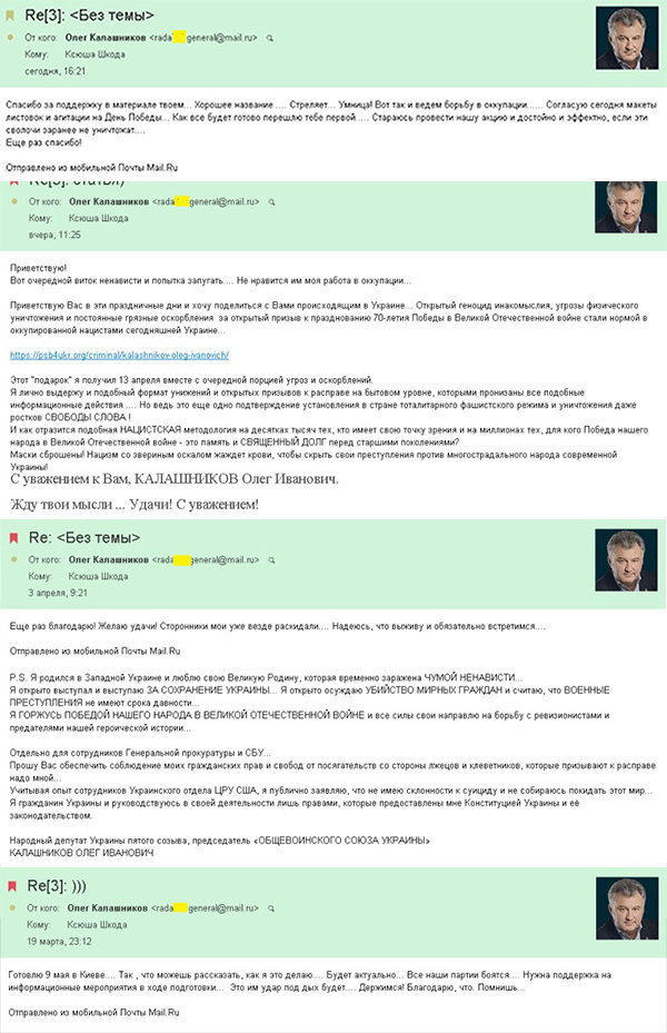 *** Издание "Украина.Ру" публикует последние письма Олега Калашникова украинской журналистке Оксане Шкоде. "Последнее письмо по электронной почте я от него получила в 16-21. Ровно за три часа до его гибели", - сообщила Оксана Шкода "Спасибо за поддержку в материале твоем... Хорошее название... Стреляет... Умница! Вот так и ведем борьбу в оккупации... Согласую сегодня макеты листовок на День Победы... Как все будет готово перешлю тебе первой... Стараюсь провести нашу акцию и достойно и эффективно, если эти сволочи заранее не уничтожат... Еще раз спасибо!", - написал Олег Калашников в одном из своих писем.