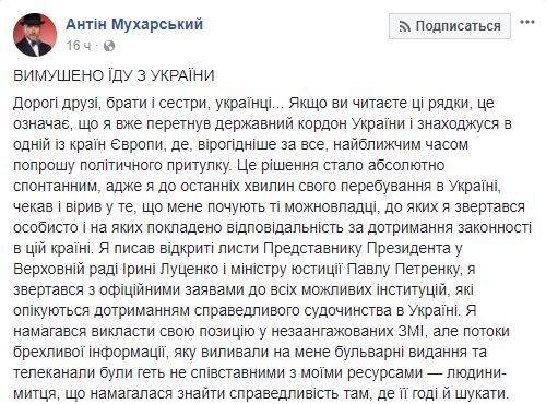 "Если вы читаете эти строки, это означает, что я уже пересек государственную границу Украины и нахожусь в одной из стран Европы, где, вероятнее всего, в ближайшее время попрошу политического убежища", – написал Мухарский.