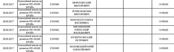 В отчете партии "Наш край" за 1 квартал 2017 года появились новые интересные детали. Так, партия получила около 376 тысяч гривен взносов от физлиц. Как и ранее, большинство этих средств было внесено практически одинаковыми платежами и в течение одного дня - 28 февраля 2017 года.