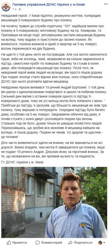 В Киеве 15-летний Андрей Буртовой рискуя собственной жизнью спас жителей горящей многоэтажки. Об этом сообщается на странице в Facebook ГСЧС в г. Киеве, передает Апостроф.