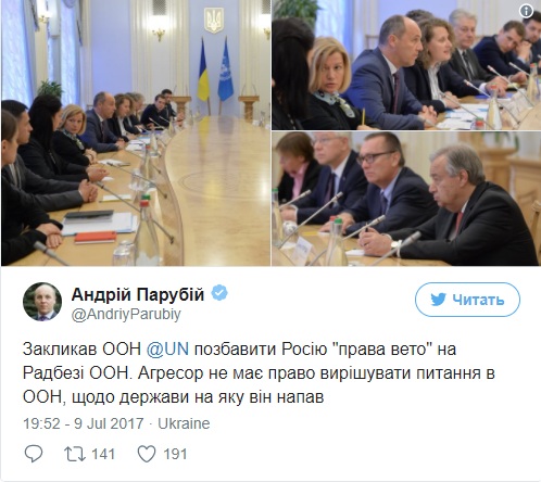 "Сейчас, когда российская агрессия продолжается, Украина крайне нуждается в сильной и действенной ООН. Я убежден, что Россия должна быть лишена права вето по вопросам, которые касаются Украины", − отметил глава парламента на встрече с генеральным секретарем ООН Антонио Гутерришем.