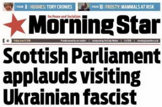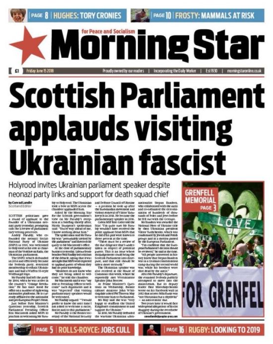 Так, газета Morning Star на первой полосе разместила статью под названием «Шотландский парламент аплодирует визиту украинского фашиста». Если же заглянуть на сайт издания, то вся поездка неонациста-спикера сопровождалась разоблачительными материалами об украинском нацизме. 15 июня увидели свет материал о том, что в шотландском парламенте принимают основателя неонацистской партии, и заметка о финансировании украинским властями неонацистских группировок. Об истинном отношении к Украине свидетельствует и появившаяся накануне приезда А. Парубия в авторитетнейшем британском издании The Timesкарта России с Крымом. Естественно, посол Украины Н. Галибаренко, прославившаяся нелепыми нарядами, тут же отозвалась протестом, потребовав у газеты изменить карту. Надо полагать, весь тираж был отозван, тщательно собран со столов лордов и биржевых воротил Сити и сожжен под крики «Слава Украине».