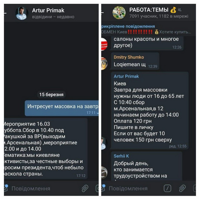 Накануне проведения "Порох-тура" в Киеве в общественных группах по поиску работы или подработки появилось сообщение. Молодой человек по имени Артур предлагал всего лишь за 120 грн поучаствовать в массовке, в поддержку честных выборов. Мол, нужно попросить президента, чтоб в стране не произошел раскол.