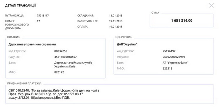 Так, согласно документов, Государственное управление делами заплатило государственному авиационному предприятию Украина 19 января. Деньги пошли на авиаперевозки украинской делегации по маршруту Киев-Цюрих-Киев.