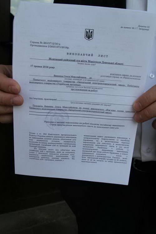 Не помогло даже решение суда Жовтневого района Мариуполя, согласно которому Винник должен быть восстановлен на своей должности. Точно так же безрезультатными оказались и массовые забастовки на предприятии, которые сотрудники ЗЭРЗ устраивают в поддержку своего директора.