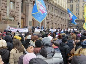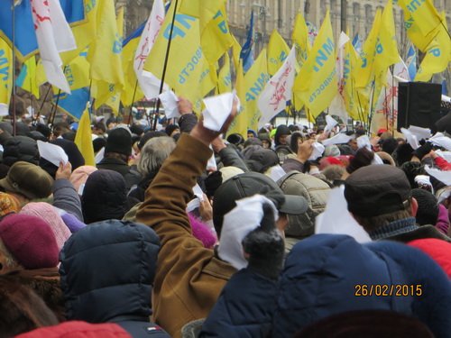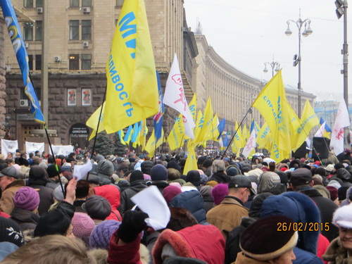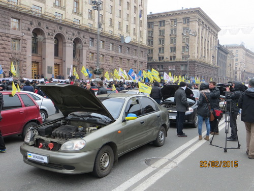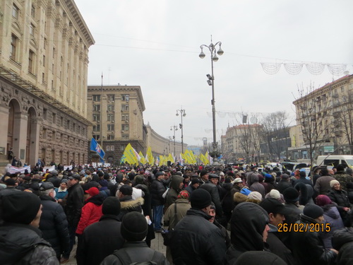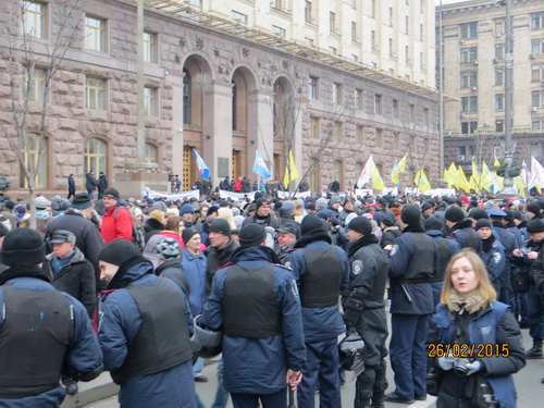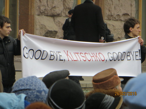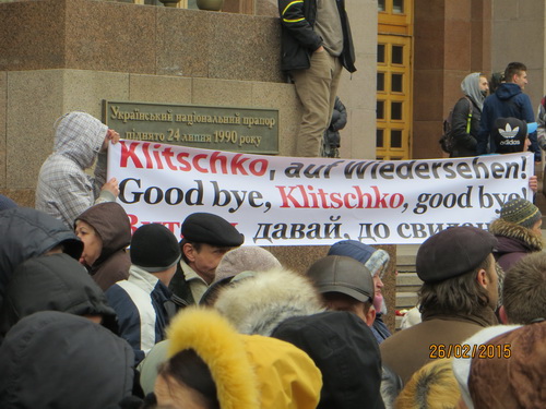 26 февраля киевляне пикетировали городской совет с требованием отставки мэра Киева - известного боксера, одного из героев Евромайдана, Виталия Кличко. Выступающие на митинге крыли деятельность Кличко правдой-матушкой о росте тарифов на транспорт, о росте цен и тарифов по коммунальным услугам, о безработице и нищенских пенсиями и зарплатами. Водители легковушек фактически перекрыли Крещатик, имитируя поломку своих машин. Претензии к Кличко перерастают в ненависть. Это первая серьезная акция в Киеве против героя Евромайдана.