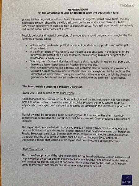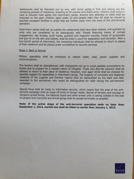 В распоряжении журналистов оказался документ, предположительно подготовленный специалистами американского стратегического исследовательского центра RAND Corporation. Он включает в себя три стадии действия карательных сил на востоке Украины. План подразумевает расстрел взятых в плен ополченцев и сочувствующих им мирных жителей, создание фильтрационных лагерей, изъятие имущества жителей региона для поощрения наиболее отличившихся при проведении карательной операции солдат.