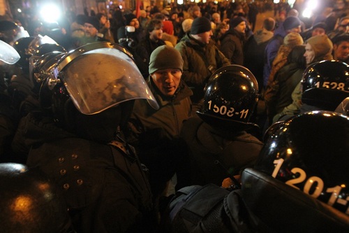 Не успели загореться первые шины, как всю длину Крещатика заняла полиция, быстрым маршем направлявшаяся к Дому профсоюзов. Силовики в бронежилетах и касках сгруппировались возле бывшего кафе «Каратель», а потом перекрыли улицу, став лицом к Украинскому дому. Одни в руках держали носилки и огнетушители, другие были вооружены тактическими дробовиками. Впрочем, митингующие и не пытались прорвать оцепление и пойти к правительственному кварталу.