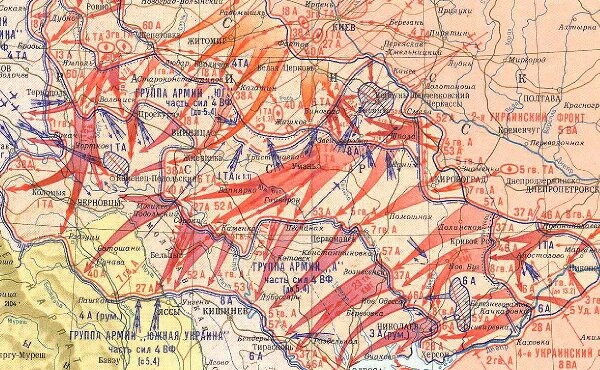 Блокировка немецко-румынской 17-й армии в Крыму, окружение под Корсунь-Шевченковском, Каменец-Подольском, Бродами, на реке Прут, Витебском, Минском и.т.д. Границу СССР, Красная армия прошла, чуть ли не маршевым шагом. Немцы бежали.