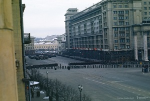 С балкона американского посольства он заснял, как сотни солдат образуют длинный коридор, по которому на Красную площадь выносят гроб с телом Сталина.