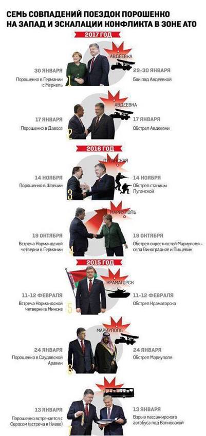 Текст, сопровождающий картинку гласит: «Семь совпадений поездок Порошенко на Запад и эскалации конфликта в зоне АТО».