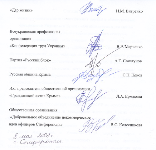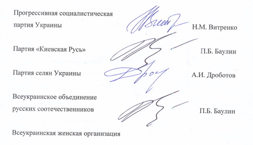 Соглашения подписали: Прогрессивная социалистическая партия Украины (Н.Витренко); Партия "Киевская Русь" (П.Баулин); Партия селян (А.Дроботов); Всеукраинское объединение русских соотечественников (П.Баулин); Всеукраинская женская организация "Дар жизни" (Н.Витренко); Всеукраинская общественная организация "Конфедерация труда Украины" (В.Марченко); Партия "Русский блок" (А.Свистунов); Русская община Крыма (С.Цеков); общественная организация "Гражданский актив Крыма" (и.о. председателя Л.Ермакова); общественная организация "Добровольное некоммерческое объединение вдов офицеров Симферополя" (В.Колесникова).