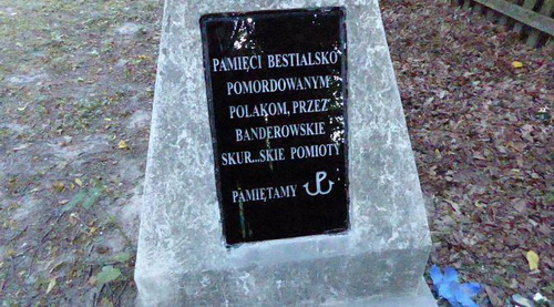 Тем временем, на одном из разрушенных памятников УПА, была установлена табличка в память об убитых бандеровцами поляках. В тексте таблички указано: "Полякам, погибшим от бандеровских выродков".