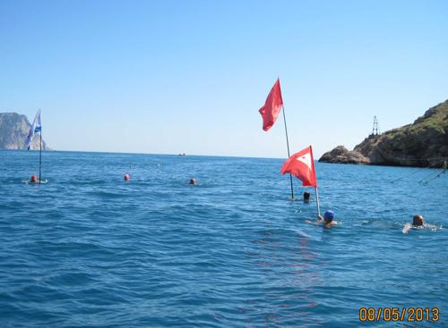 Отважные пловцы со Знаменем Победы, флагами ВМФ СССР и города-героя Севастополя преодолели расстояние около 3 км, стартовав в районе пляжа "База отдыха Васили" и финишировали на пляже "Матросский" под бурные приветствия многочисленных отдыхающих.