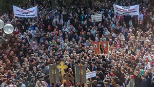 А между тем Украинская церковь уже начала мобилизовать верующих. По всей стране собирались подписи под обращением к депутатам с просьбой не принимать явно антиконституционный закон. Тысячи людей собрались у стены Верховной рады на молитвенное стояние, чтобы, как заявили в Церкви, "Господь вразумил народных избранников не принимать антицерковные законопроекты, которые вынесены на повестку дня заседания".