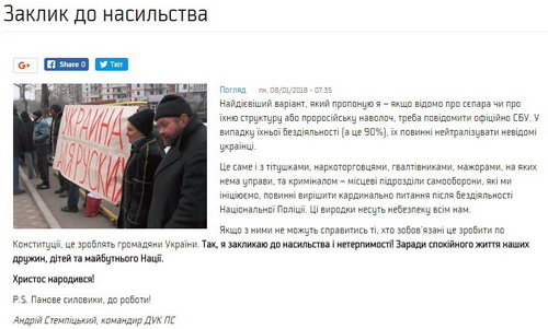 «Самый действенный вариант, который предлагаю я - если известно о сепаре или об их структуре или пророссийской сволочи, надо сообщить официально СБУ. В случае их бездействия (а это 90%), их должны нейтрализовать неизвестные украинцы. [...] Если с ними не могут справиться те, кто обязаны это сделать по Конституции, это сделают граждане Украины. Да, я призываю к насилию и нетерпимости! Ради спокойной жизни наших жен, детей и будущего нации», - заявил написал Степмпицкий, которого цитирует сайт «Правого сектора».