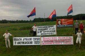 Роменская организация ПСПУ в этот день с 7.00 начала пикетирование этих учений и последней оставила это место, где проходило данное всеукраинское мероприятие. На самом видном месте мы разместили информационные плакаты, которые показывали позицию ПСПУ по внешнему вектору развития Украины. Наши лозунги: "Православной Украине православных братьев, а не европейских иноверцев", "Пошлем дряхлую Европу в американскую попу", "Поддержим Медведева, Назарбаева, Лукашенко в создании Евразийского экономического союза". И, конечно же, мы вывесили портрет лидера ВОО "Евразийского народного союза", Председателя, единственной пророссийской партии в Украине - ПСПУ, Наталии Витренко.