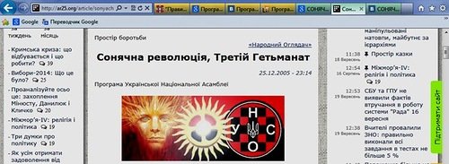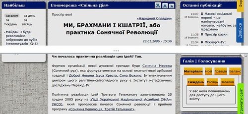 Так, например, на сайте УНА-УНСО в декабре 2005 году была опубликована программа Украинской национальной ассамблеи под названием "Солнечная революция, Третий Гетманат". После начала переговоров с "Тризубом" о создании "Правого сектора" она, правда, была снята, чтобы не раздражать правоверных бандеровцев "нестандартным" мышлением, но сохранилась .