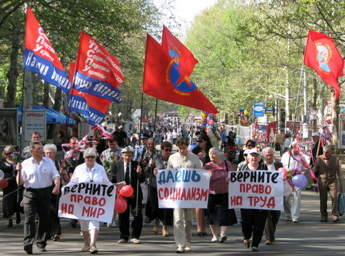 Прогрессивные социалисты несли плакаты, уличающие нынешнюю власть в уничтожении прав своего народа: "ВЕРНИТЕ ПРАВО НА ТРУД", "ВЕРНИТЕ ПРАВО НА МИР", "ДАЁШЬ СОЦИАЛИЗМ!".