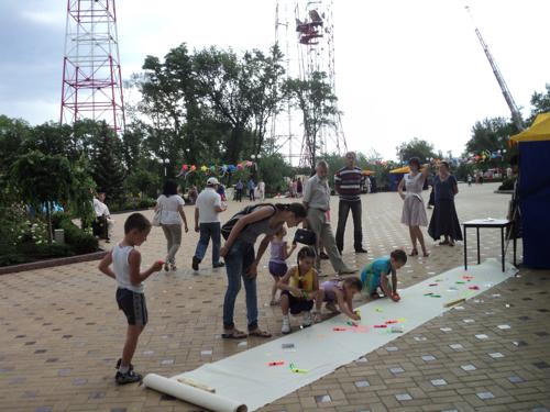 На территории центра Славянской культуры, который находится в Ленинском районе города Донецка, был устроен детский праздник с конфетами, мороженным, играми. Дети рисовали , пели, танцевали, рассказывали стихи.